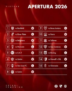 Tras el debut, el Rojo enfrentará a River Plate, Belgrano, Huracán, SAT, Unión, San Luis FC, Lanús, Boca Juniors, Ferro, Talleres, San Lorenzo, Racing Club, Newell’s Old Boys y Gimnasia y Esgrima La Plata, en busca de recuperarse y ser protagonista en el campeonato.