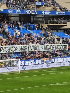 Durante el partido entre Real Oviedo y Celta de Vigo, los hinchas locales desplegaron banderas y mensajes dirigidos al Grupo Pachuca con una consigna contundente: “Más fútbol y menos negocio”, en señal de disconformidad con la gestión de los dueños del club.