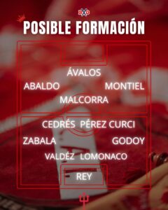 Rodrigo Rey; Leonardo Godoy, Kevin Lomónaco, Sebastián Valdéz, Facundo Zabala; Lautaro Millán, Rodrigo Fernández Cedrés, Luciano Cabral o Ignacio Malcorra; Santiago Montiel, Gabriel Ávalos y Matías Abaldo.